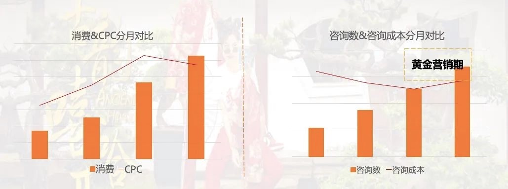 在武汉婚摄投放的案例上,通过优化可见:在CPC后期保持平稳情况下,消费增长明显;而伴随着咨询数不断增长,黄金营销期增长明显,转化成本保持平稳。同时其消费增长,成本稳定并持续达到最优水平;在黄金营销期,咨询数大幅上升,且成本稳定。