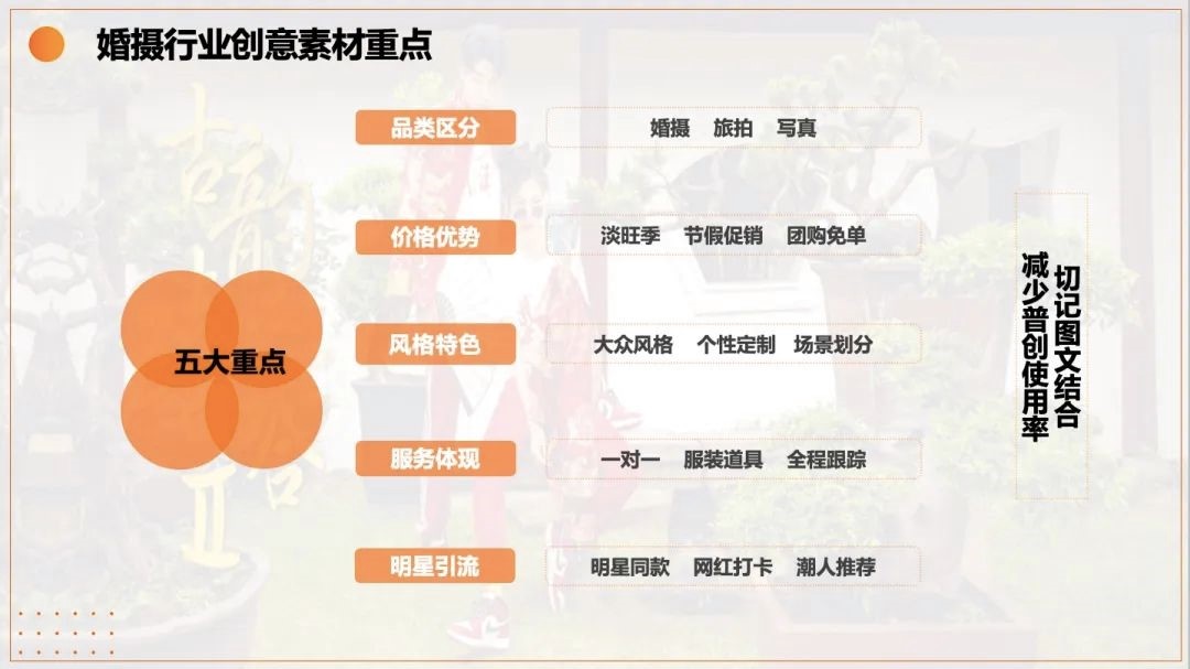 婚纱摄影作为摄影行业的重要细分,要想做到高效引流,需要精准沟通潜在客户,并且能够直接准确地满足用户拍摄需求。婚摄行业的投放中,创意非常重要,应依循品类区分、价格优势、风格特色、服务体现、明星引流五大重点。